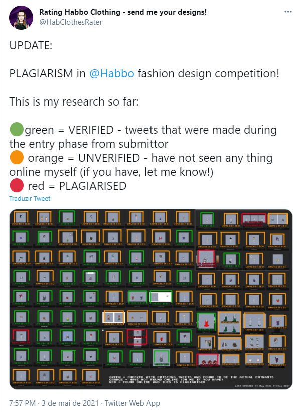 Como já é de costume, o plágio foi outro problema bem presente nessa competição. Tentando encontrar brechas e se aproveitar da ignorância dos seletores, algumas pessoas simplesmente copiaram participações de outras comunidades e enviaram como se fosse delas. E esse foi o caso que aconteceu com a manuela4412, do Habbo PT/BR, que teve seu visual copiado por um jogador do Habbo TR. Mas isso tudo não para por aí, e a página @HabClothesRater do Twitter fez um trabalho importante mostrando outros casos, como podem ver abaixo.