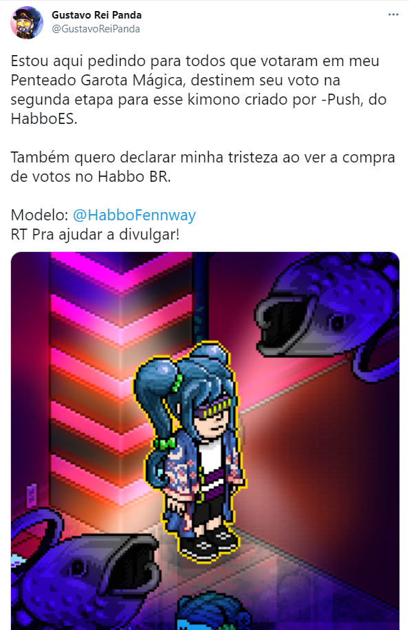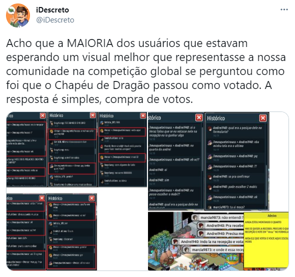 Como falamos no início deste artigo, assim como Habbo Awards 2021, a Competição Habbo Fashion Design também teve seu objetivo deturpado. Com a divulgação do tão aguardando resultado, a comunidade brasileira se empenhou em escolher seu favorito, e o que poderia ser uma festa, acabou virando um enterro, já que o visual vencedor, que representa o Brasil na votação global, nem se quer figurava entre os favoritos. Passando-se o choque, uma justificativa parecer ter vindo à tona: a compra de votos. Como podem conferir abaixo na denúncia feita pelo jogador iDescreto.