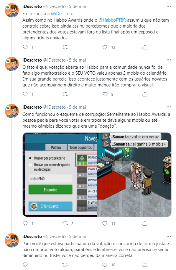 A indagação que faço aqui, é a mesma que fiz ao falar Habbo Awards: do que adianta vencer algo, sem ter mérito na vitória, e até quando casos claros de irregularidades serão tolerados? Tudo isso só torna cada vez mais a comunidade um lugar desagradável que, ao invés de acolher, só afasta as pessoas.